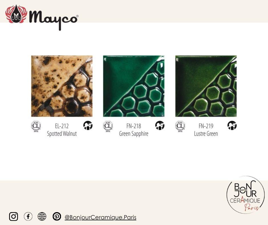 Les gammes d’émail pour la faïence Mayco sont à disposition, sous forme liquide, en pot de 118ml prêt à l’emploi.